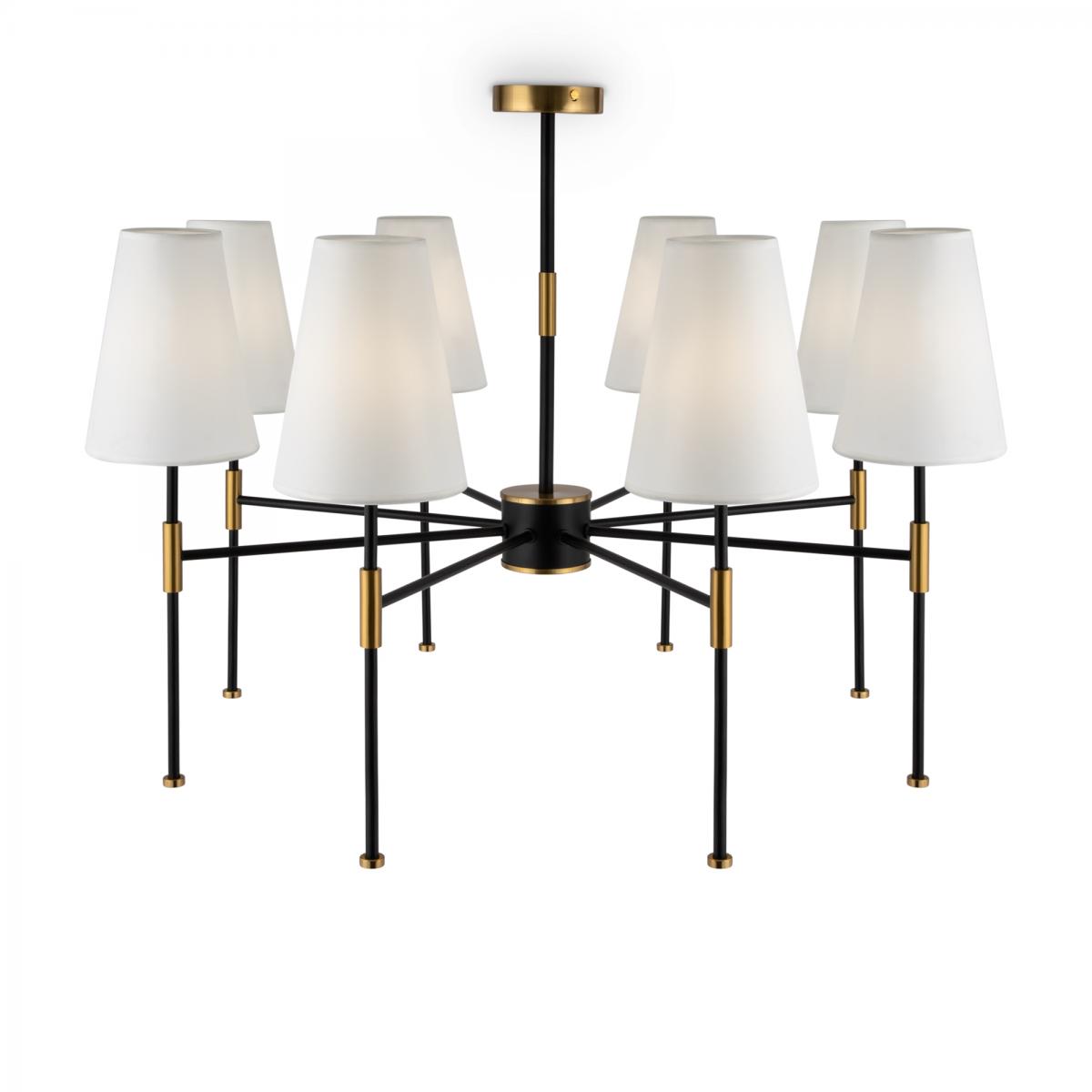 Материал арматуры – металл. Оттенки: хром, комбинация черного и латуни. Абажуры – белая ткань. Акцентный вытянутый силуэт. Источник света – лампа с цоколем E14.