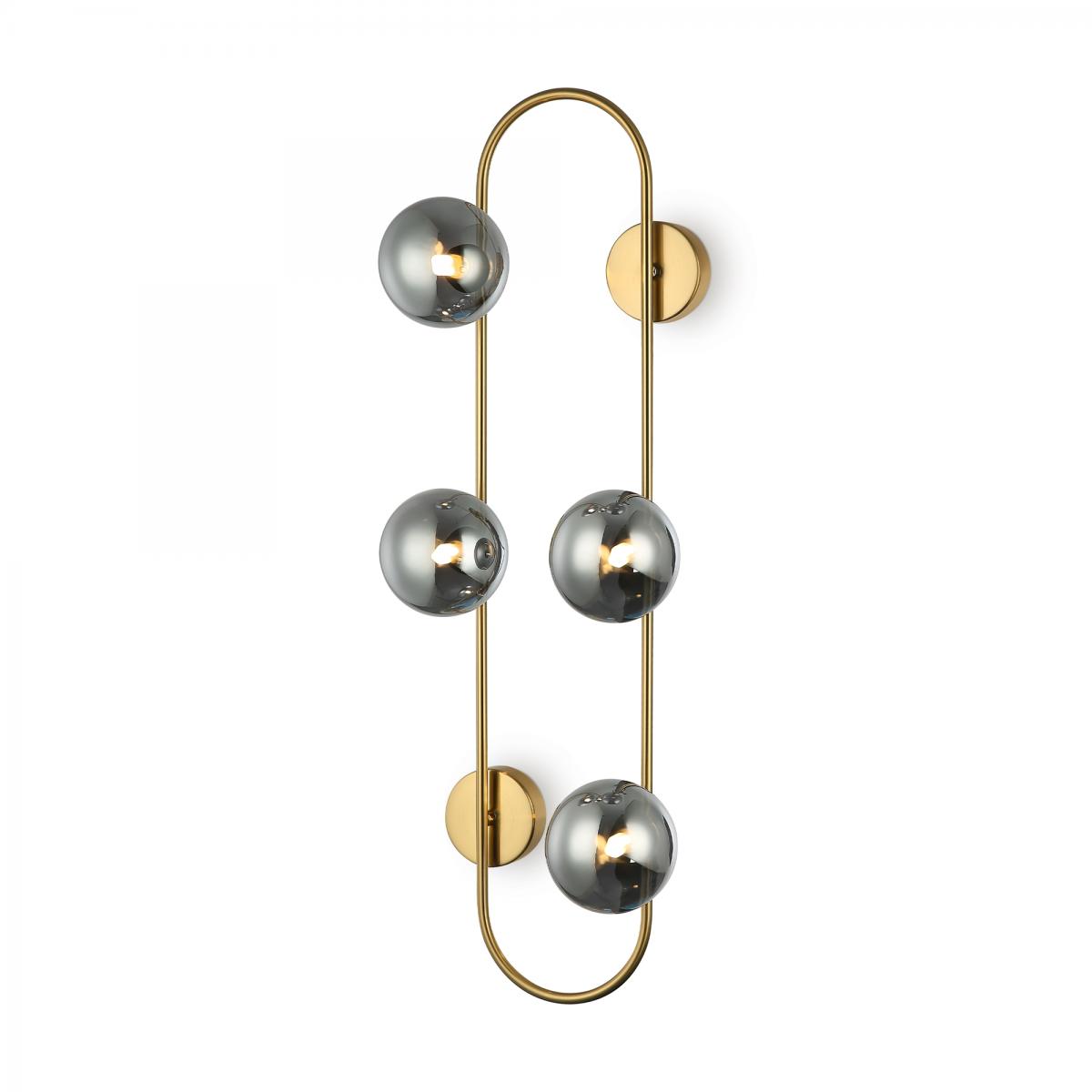 Арматура - металл, цвет - латунь. Стеклянные плафоны-сферы в двух оттенках белый матовый и дымчатый в настенно потолочной версии. Округлые и плавные линии - беспроигрышное сочетание для современных интерьеров. Настенные бра можно использовать как для общего на потолке так и для зонального настенного освещения Источник света - лампа с цоколем G9.