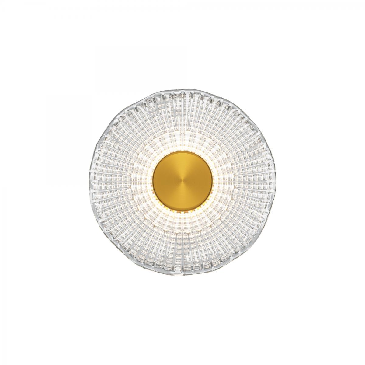 Металлическая арматура, цвет - латунь. Декоративные плафоны из литого стекла. Они рассеивают свет и дают легкие блики на стенах. Стекло плафонов может быть прозрачным или тонированным с паттерном молочного оттенка. Встроенный LED-источник света имеет цветовую температуру 3000 К, угол рассеивания — 120 градусов.
