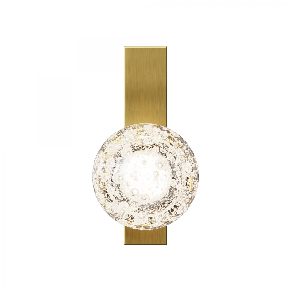 Плафон выполнен из стекла ручной работы с уникальными выдувными пузырьками. Арматура выполнена из алюминия в цвете сатинированной латуни. Сменный источник света с цоколем G9. Каждый светильник уникален благодаря индивидуальной технике ручного выдувания стекла. Обеспечивает мягкое рассеянное освещение, идеально подчеркивающее текстуру стекла. Предназначен для создания изысканных акцентов в интерьерах классического стиля и ар-деко. Рекомендуется для гостиных, спален, коридоров и ресторанов.